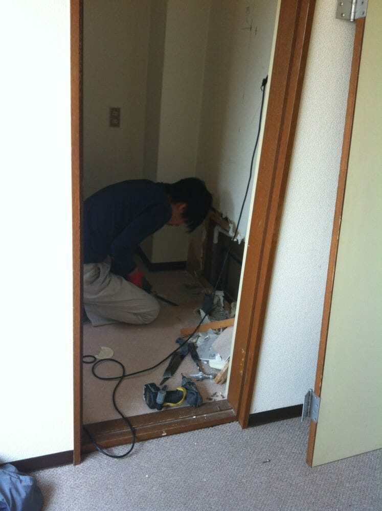 洗面台の撤去中です、水道屋さんの上尾田さん↓