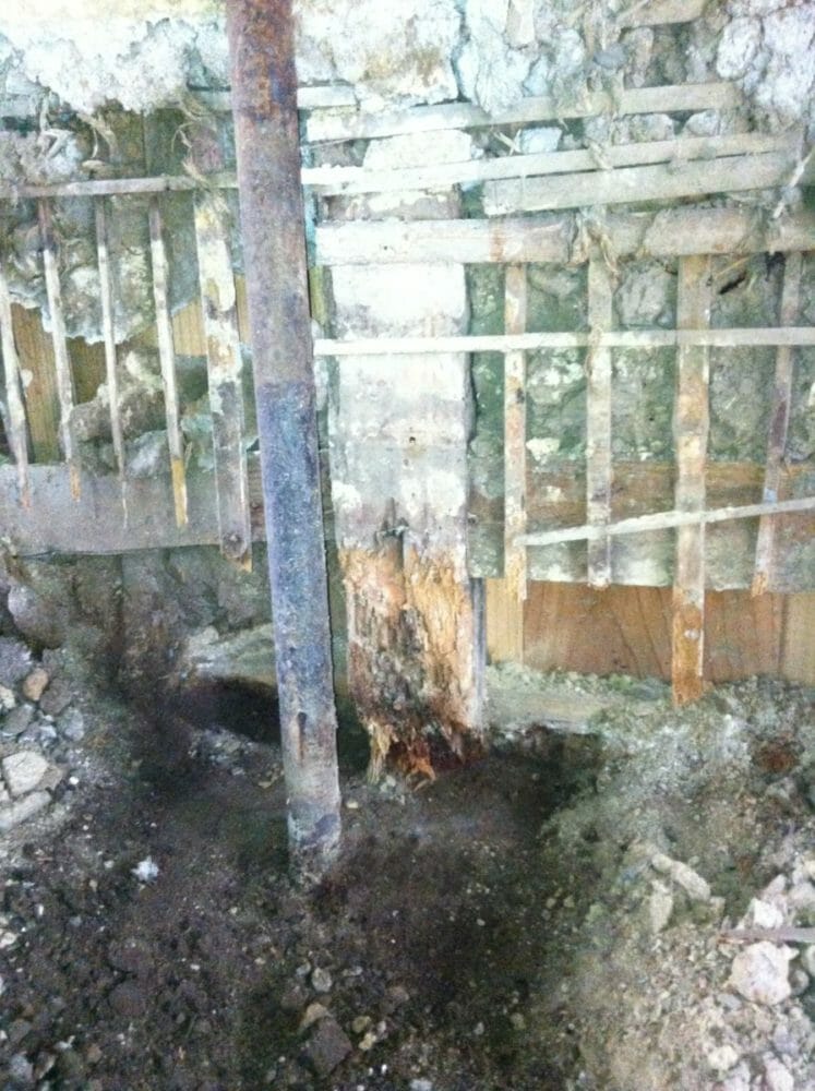 シロアリに食べつくされ、宙に浮いている柱の足元が出てきました。